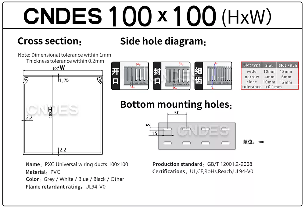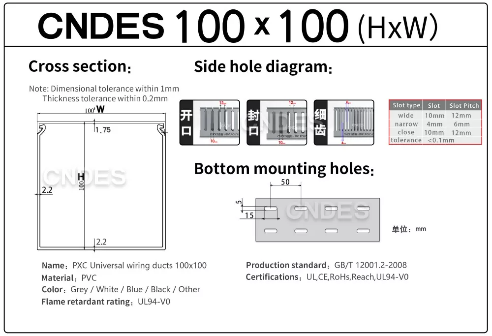 Optimizatu zure kable-proiektuak 100×100 kableen kudeaketa pertsonalizatuko kable-hodiekin. Txinan PVC kable-erretiluen fabrikatzaile eta hornitzaile nagusi gisa, CNDES-ek irtenbide fidagarriak, doitasun handikoak eta pertsonalizagarriak eskaintzen ditu zure kableen kudeaketa behar guztietarako. Hari-hodien zehaztapen guztiak ditugu (kable-erroiluak). Beste zehaztapen batzuk behar badituzu, jar zaitez gurekin harremanetan!