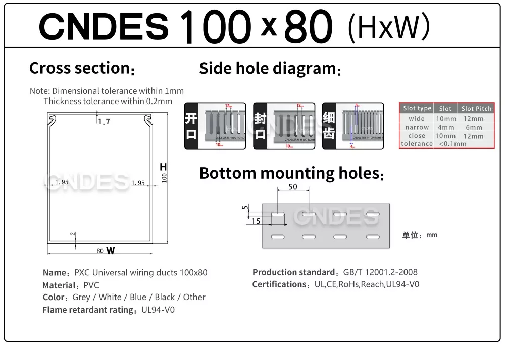 Gure 100 × 80 malgu zirrikitu PVC kableatu hodiak barne-espazio zabala eta zirrikitu-egitura malgua eskaintzen ditu, kableen bideratzea, doikuntzak edo eremuan hedapenak errazteko aukera emanez. Espazioaren erabilera eta malgutasuna funtsezkoak diren aplikazioetarako aproposa da, hala nola kontrol-armairuak, industria-panelak, automatizazio-sistemak eta itxitura elektrikoak.