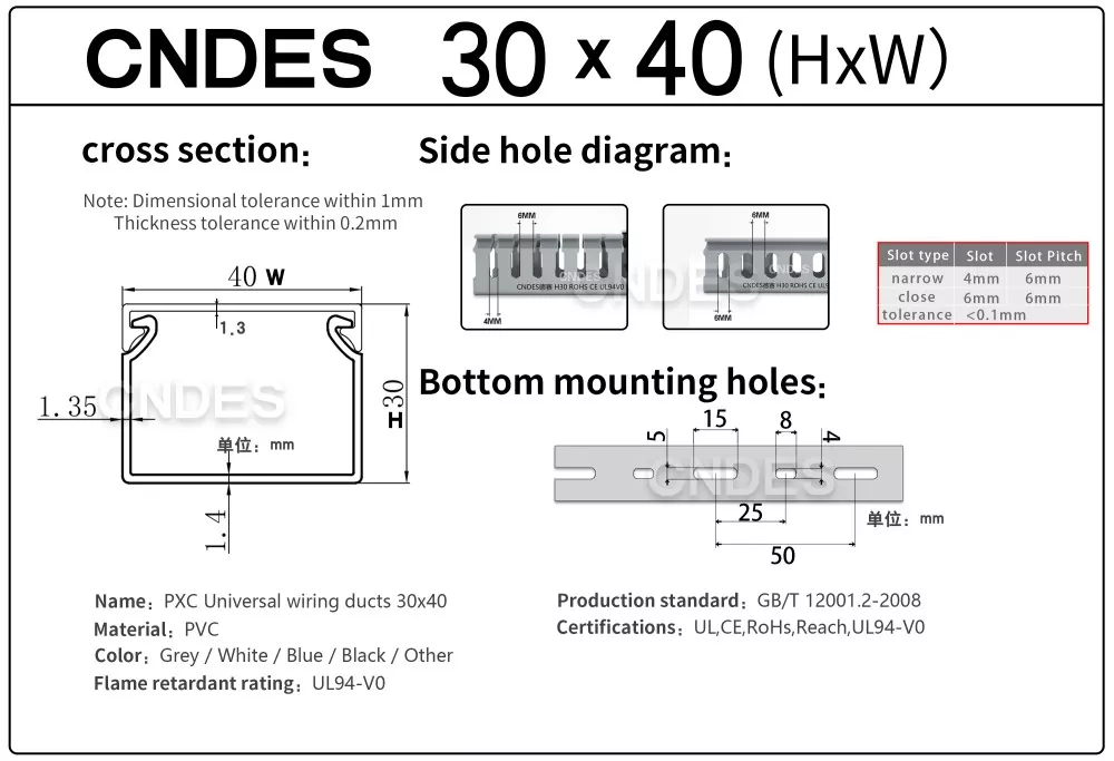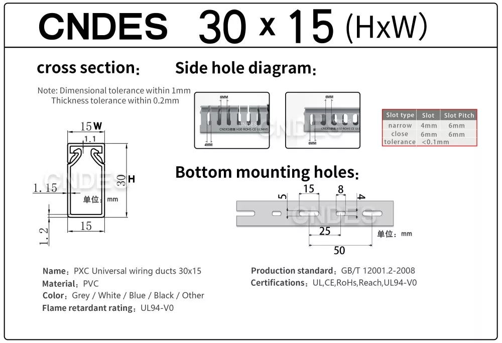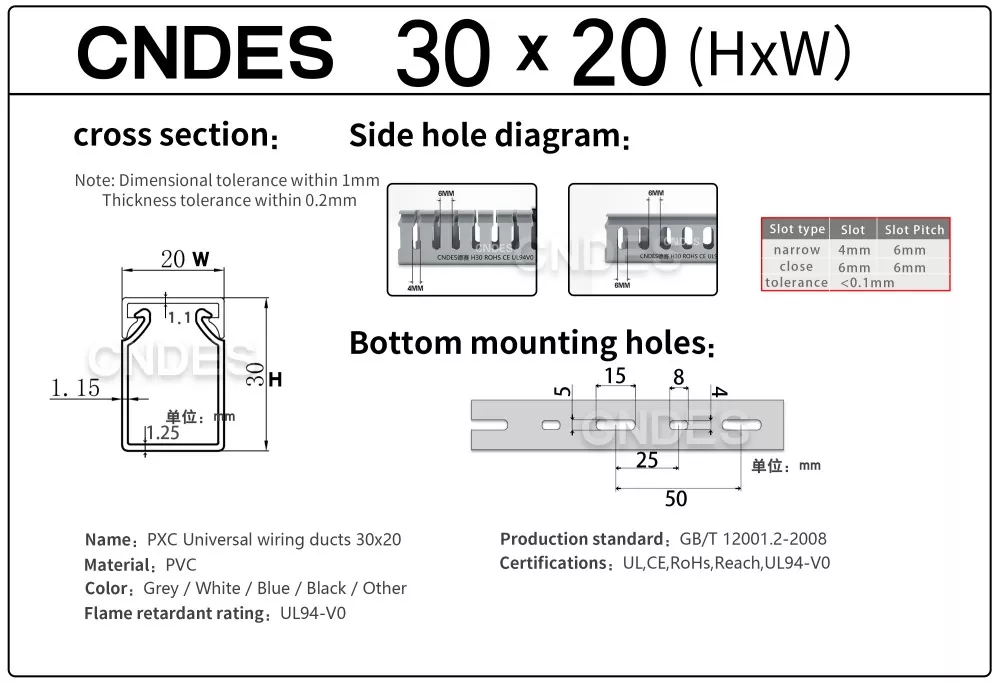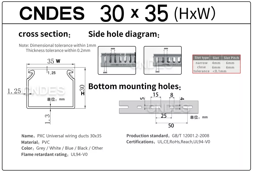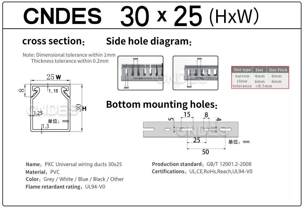CNDES-en 30 mm-ko altueran zirrizatutako PVC kableen kudeaketa pertsonalizatua kableen bideratze eraginkor, trinko eta segururako diseinatuta dago hainbat industria, merkataritza eta egoitza ezarpenetan. Espazio-murriztapenak dituzten aplikazioetarako aproposa, hodi honek zure kableatuak antolatuta, babestuta eta erraz eskura daitezkeela ziurtatzen du.