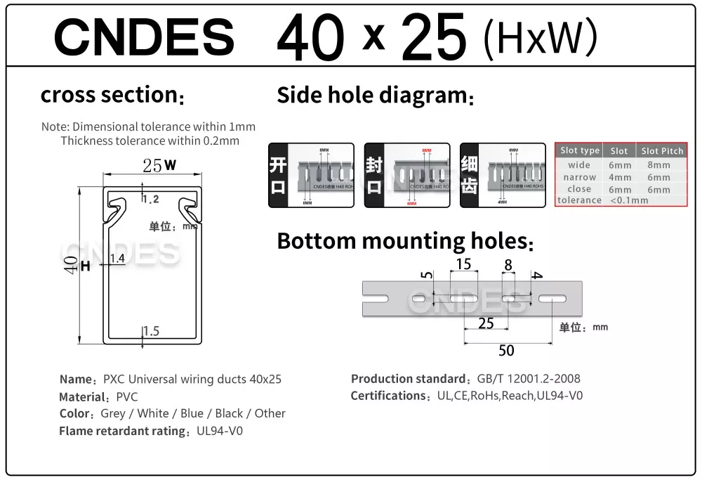 CNDESen 40 × 25 PVCko kableatua instalatzeko kanal pertsonalizatua panel elektriko trinkoetarako, kontrol armairu txikietarako eta itxitura industrialetarako diseinatuta dago. Bere 40 × 25 mm-ko profil meheak kableen antolaketa txukuna ahalbidetzen du espazio estuetan, energia, seinalea eta datu-lerroak ondo bereizita mantenduz, irisgarritasuna eta segurtasuna hobetuz.