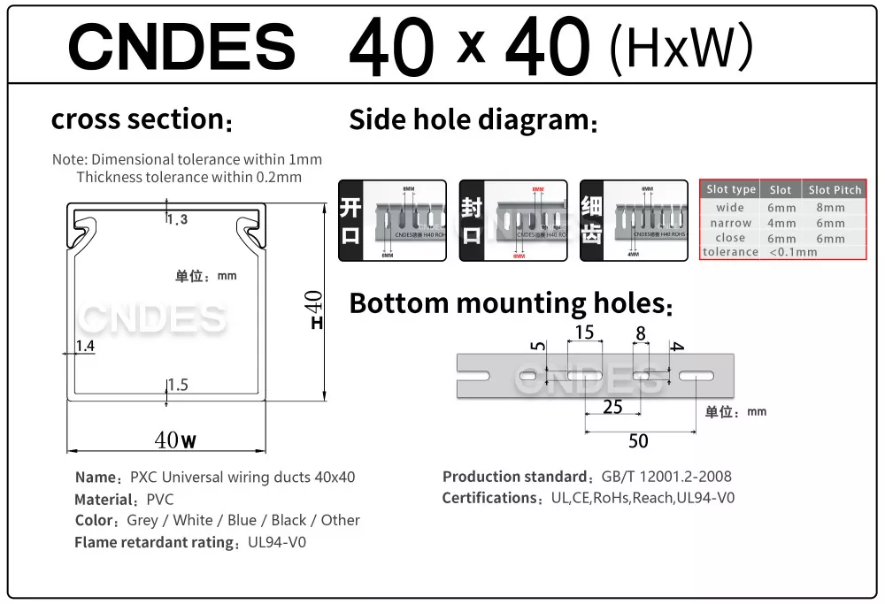 CNDES-en Errendimendu Handiko 40×40 PVCko kableatuaren kanalizazioa estaliarekin kableak kudeatzeko soluzio polifazetikoa da, kontrol-panel txiki eta ertainetarako, armairu industrialetarako eta itxitura elektrikoetarako diseinatua. Bere 40×40 mm-ko profil karratuak potentzia, seinalea eta datu-kableen antolaketa txukuna ahalbidetzen du, panelen espazioa maximizatzen duen bitartean. Estalkia duen PVC-ko kable zirrikitudun hodiak atxikitzeko edo irristakorra duen diseinua du, tresnarik gabe ireki eta ixteko. Modelo batzuek beheko alboko hormetan aurrez moztutako lerroak dituzte, erraz mozteko edo kentzeko, instalazio-baldintza zehatzak betetzeko. Torlojuen zuloak behealdean edo alboetan uniformeki banatzen dira, azkar eta erraz lotzeko.