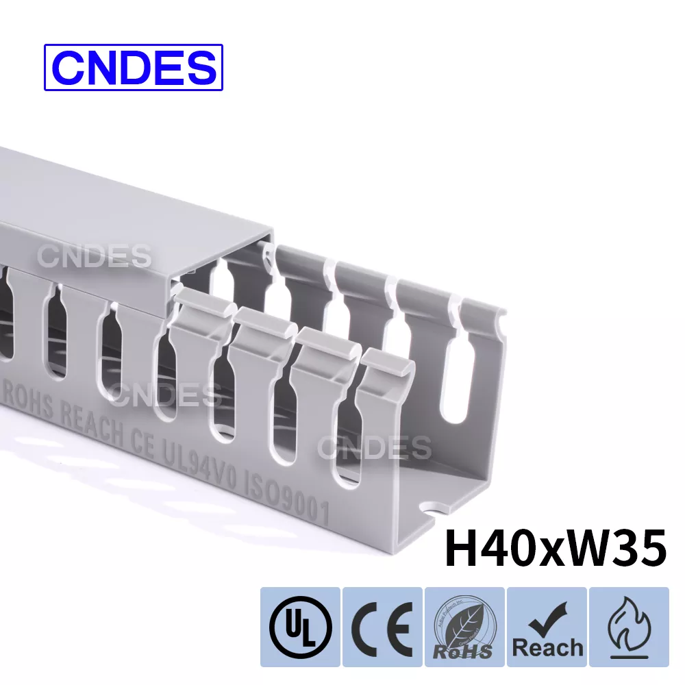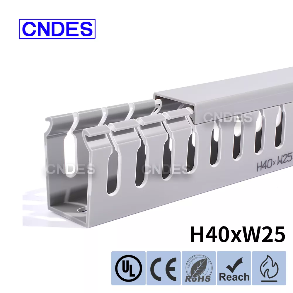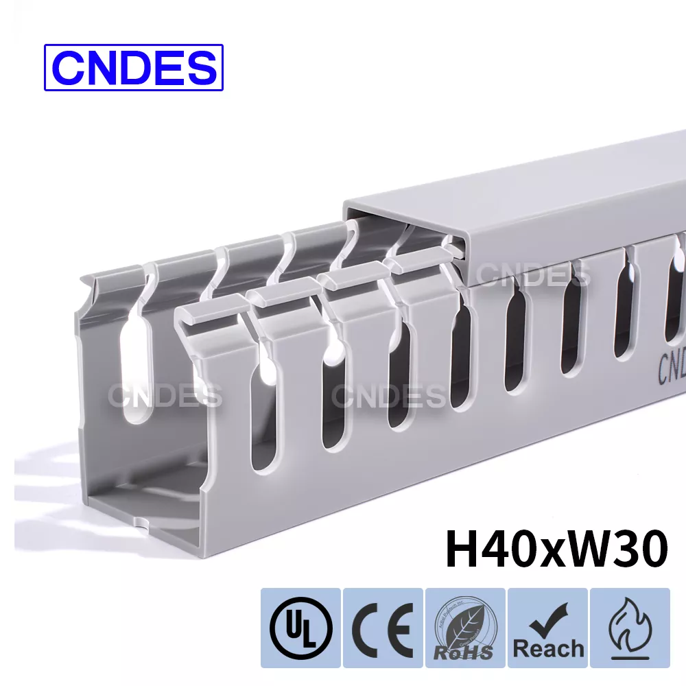 Kalitatezko 40 mm-ko altuera zirriztaturiko PVC kableatuaren kanalizazio-hodiak uniformeki banatutako zirrikituak ditu (4 mm, 8 mm) alde batean edo bietan, kableen kokapen segurua bermatuz. Diseinu honek bibrazioak, korapilatzeak edo birrintzeak saihesten ditu, kableak antolatuta mantenduz. Kanalaren oinarria eta estalkia luzera estandarrerako neurrira moztu daitezke (adibidez, 330 mm, 1,83 m), material-hondakinak gutxituz eta etorkizuneko kableen mantentze-lana edo ordezkapena erraztuz.