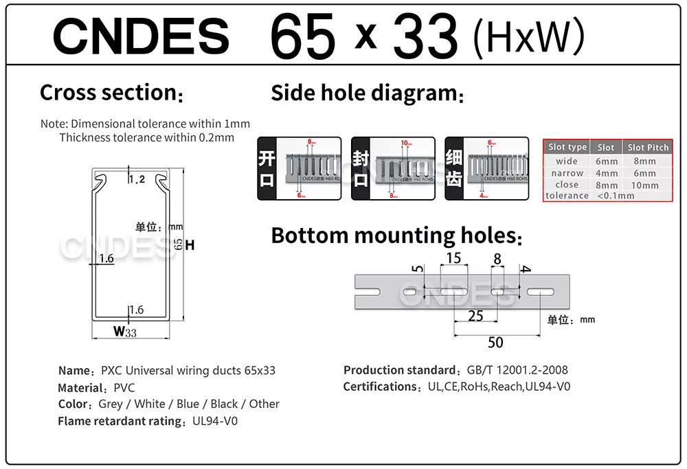 CNDESen, Kalitatezko 65 × 33 kable bideratze kanala diseinatu dugu bereziki espazioa mugatua den baina kablearen antolakuntzak oraindik garrantzitsuak diren proiektuetarako. Bideratze kanal trinko honek instalatzaileei kableatuak txukun, babestuta eta kudeatzeko erraza izaten laguntzen die panel elektrikoen, kontrol-kutxen eta itxitura trinkoen barruan.