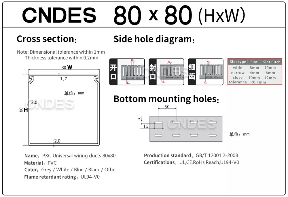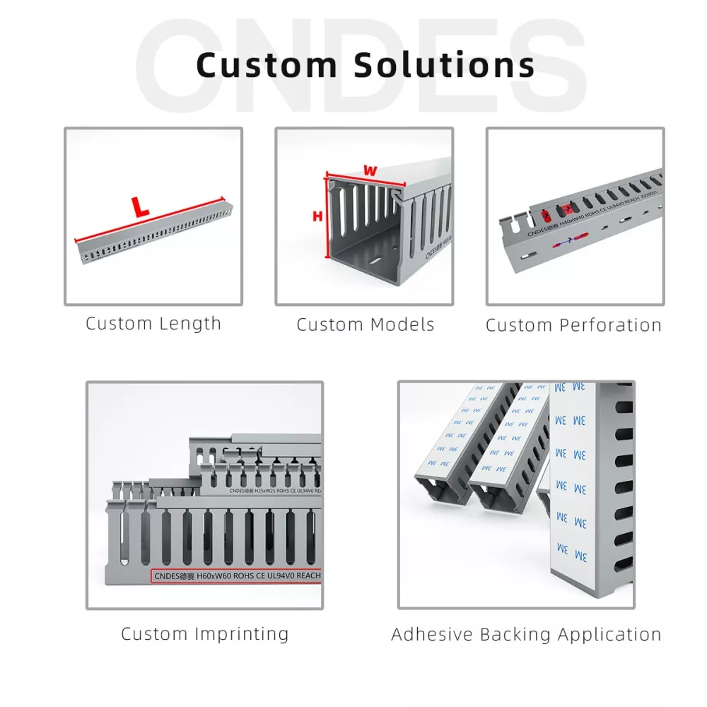 Kable-erretilu estandarrak kableatu-arnes konplexuak sartzen ez direnean, CNDES Pertsonalizatutako 80 × 80 PVC-ko Zentralaren kableatuaren kanalizazioa zure aukera ona da. 80mm * 80mm-ko barne-espazio handiarekin, eskari handiko eszenatokietarako bereziki diseinatuta dago, hala nola datu-zentroen bizkarrezurreko kableatzea, ekipamendu industrialen potentzia-klusterrak eta kontrol-armairu handietan kableatu zentralizatua. Kable kopuru handi bat erraz egokitzen eta antolatzen du, nahasteari eta pilaketari agur esanez behingoz.