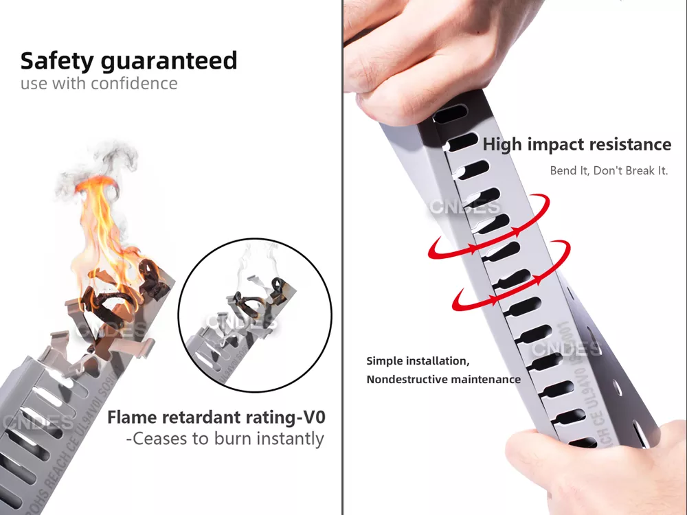 2. Industria-mailako sendotasuna, segurua eta fidagarria: Kalitatezko 80 × 80 zirrikitu PVCko panelen kableatuaren kanalizazioa suaren aurkako PVC material lodiz egina dago (UL94-V0), sendoa, iraunkorra, kolpeekiko erresistentea eta karga-gaitasun bikaina duena. Kableei babes iraunkorra eskaintzen die bibrazio-inguruneetan ere.